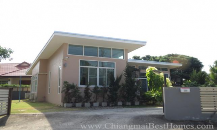 House for sale near Rimping MiChock Plaza on Maejo Rd., 98 sq.wa (392 sq.meter), 3 air conditioners, 3 hot showers, 3 bedrooms with furniture, dining room set, living room set, club house & swimming pool, 24 hours security guards.